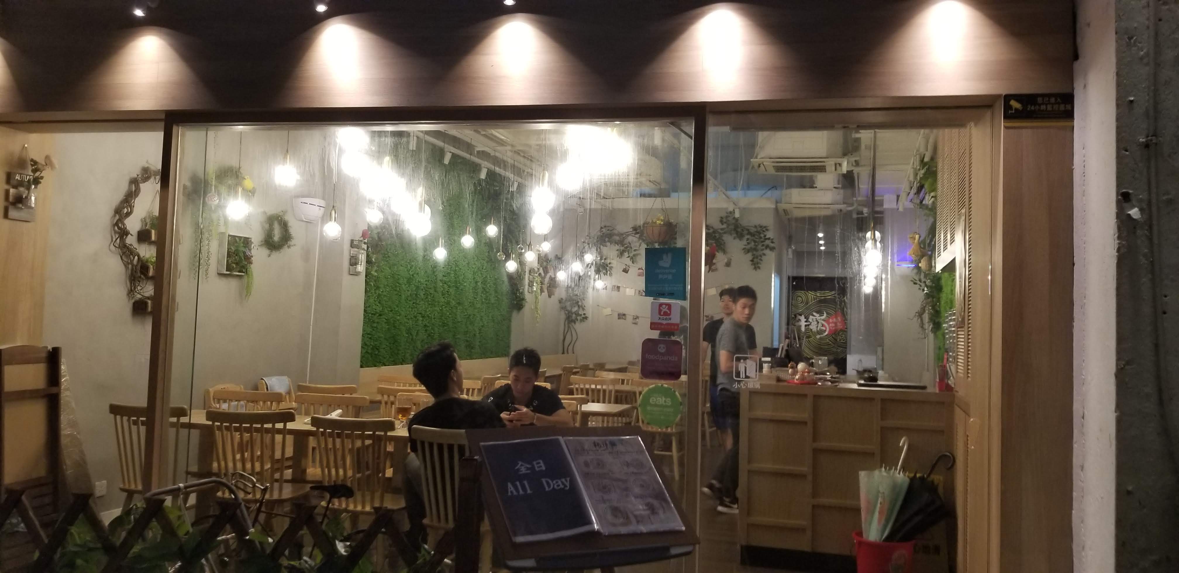 我們一行二人到達餐廳之時已經夜晚,雖然是周末,但人流不多。後巷感覺凌亂,餐廳是新裝修,感覺舒適柔和,餐廳裝修走田原風格,和外面混亂的後巷構成強烈對比。