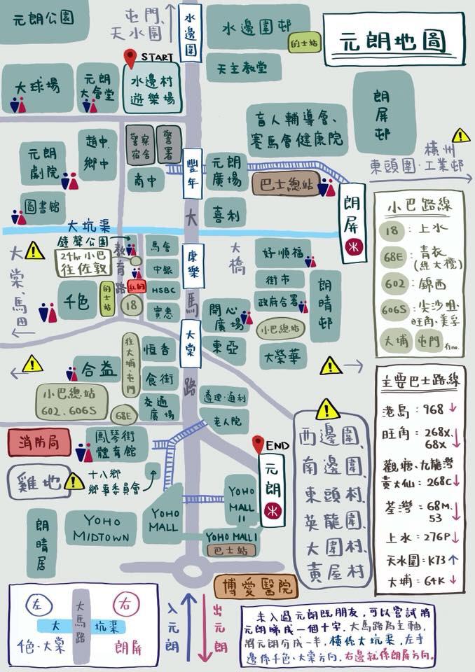 這是一張在網絡上流傳的元朗地圖,我覺得畫得好好,同大家分享下。元朗的市區其實不大,主要就是以大馬路為中心。大家可以以大馬路和輕鐵去到各個地點。